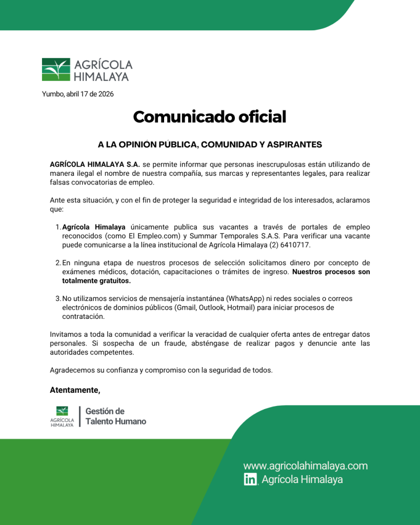En Agrícola Himalaya generamos bienestar y propendemos porque el crecimiento vaya de la mano del compromiso con las personas, el planeta y el futuro. Cada acción que tomamos está guiada por una visión sostenible que busca generar valor económico, social y ambiental de manera responsable e innovadora.